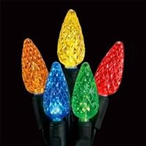 Forever Bright LED-5 Color Multi Set of 70 Micro-Chip LED Lights C6 1 1/4" Height Strawberry Shape Red, Green, Yellow, Blue and Orange Indoor or outdoor use 3.5 Watts .03 Amps Per String 24' Length, 4" Spacing, 120V, C6, UL listed. Green cord plugs end to end and/or piggy back Green Wire Forever Bright Warranty Information and F.A.Q